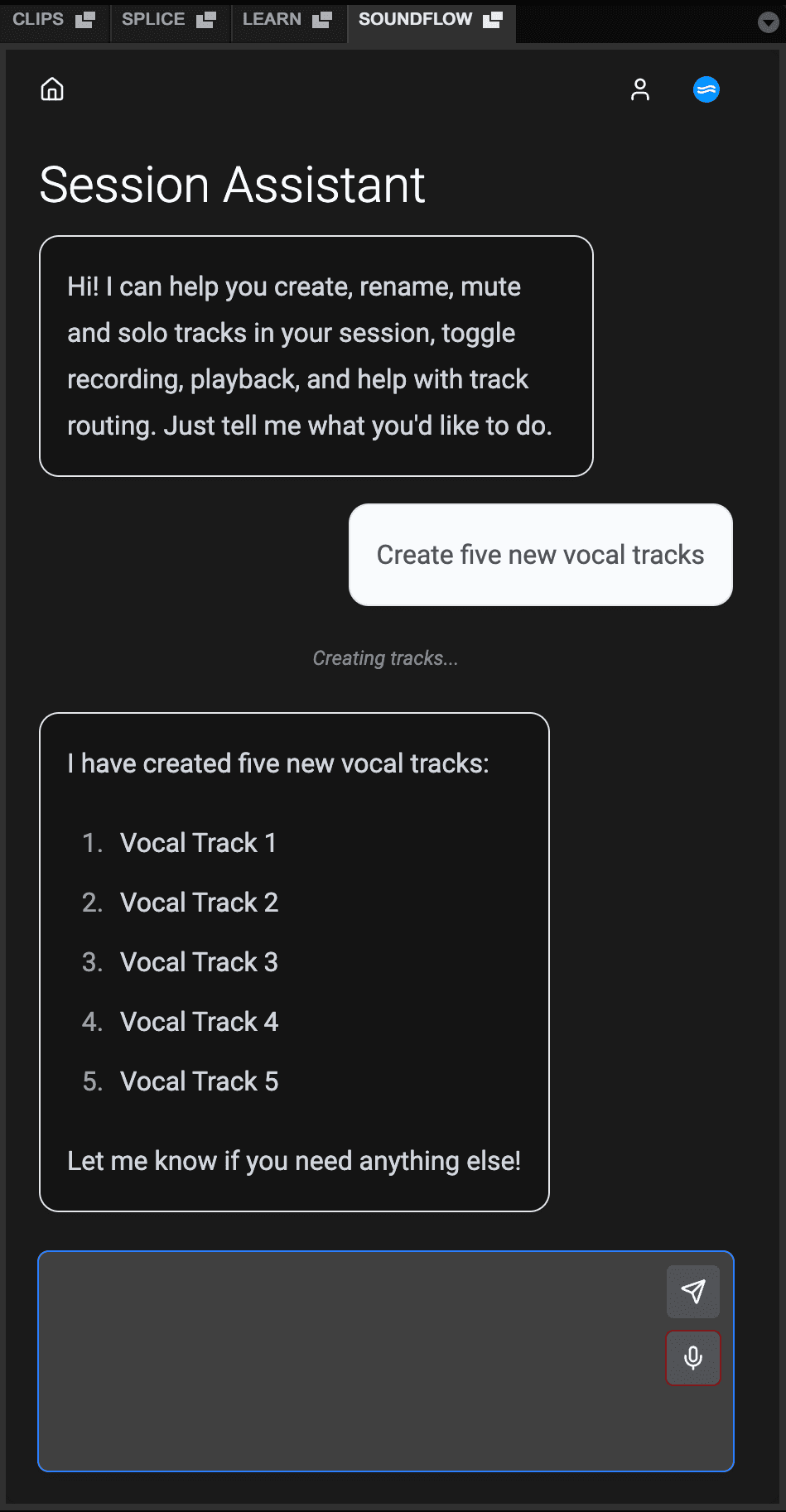 Powered by SoundFlow’s SFX framework and available directly from the new SoundFlow panel inside Pro Tools 2025.10 and later, the new Session Assistant provides a real-time conversational interface inside Pro Tools, translating natural language commands into automated actions. Designed with a familiar chat-style interface, it allows users to perform tasks such as creating, renaming, and modifying tracks, managing routing, or adjusting parameters simply by typing or speaking a request. Session Assistant understands your context, adapts to your workflow, and executes your requests.